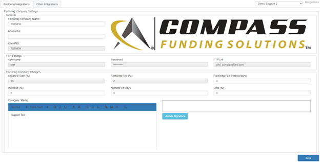 Under “Company Stamp” you can add the stamp for your factoring company so that it can be applied to the invoice PDF, and if you prefer to you can send it to us and we will do it for you.