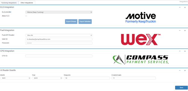 In the “Other Integrations” tab you can view information about your ELD/Fuel integration and AI details.